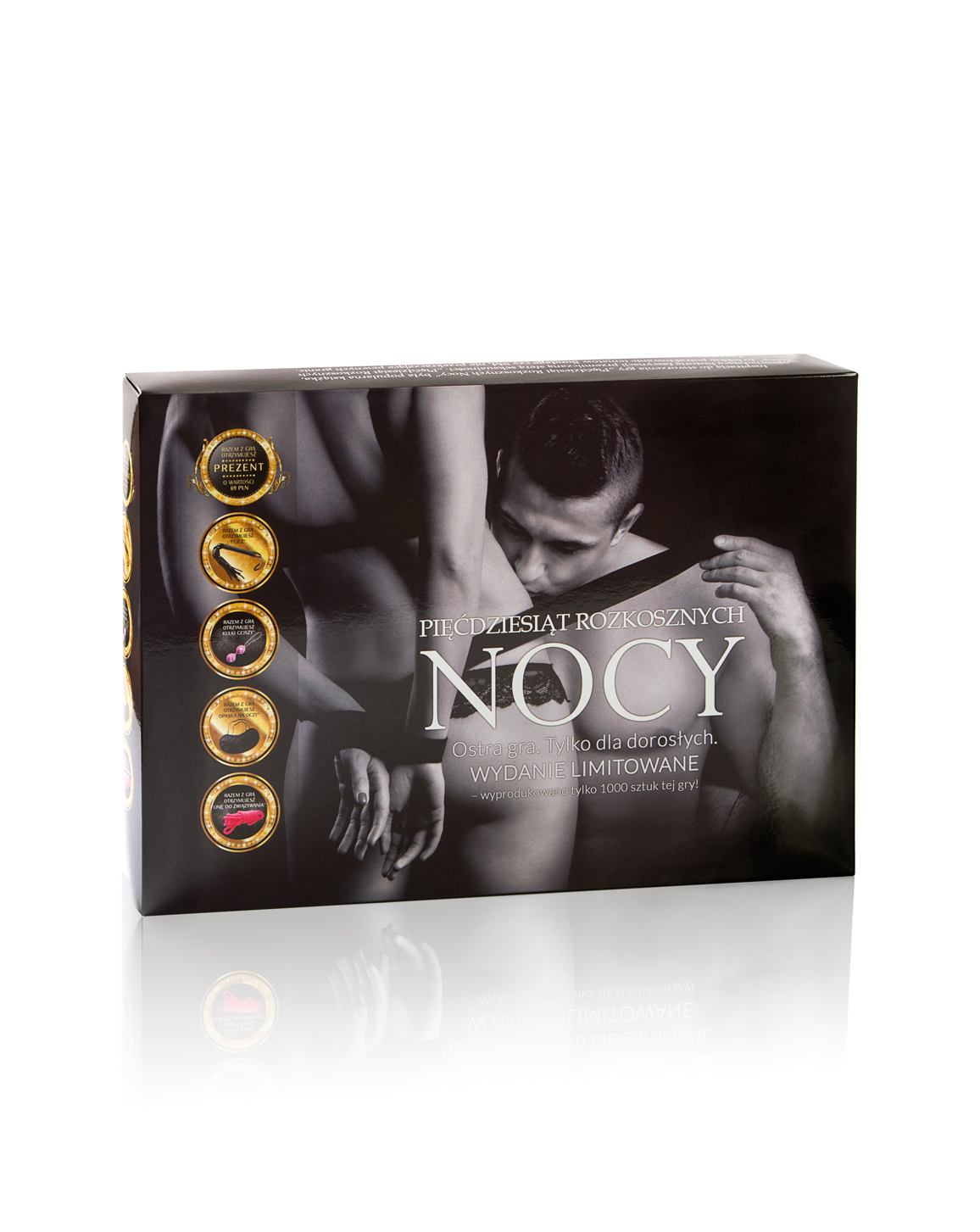 Kiedy wszedł do sypialni, stałam jak sparaliżowana. Czułam w sobie mieszankę lęku i dzikiego pożądania na myśl o tym, co zaraz wydarzy się między nami. Mały pejcz, który leżał na pościeli był zapowiedzią nowej przygody, ale także... Myśli zaczęły uciekać, kiedy poczułam, jak obejmuje moje dłonie i związuje zimną liną, zakłada opaskę na oczy... na swoich pośladkach czułam twardy dotyk jego męskości... czułam, że już jest gotowy, by wejść ale to był dopiero początek naszej przygody...Chcesz doświadczyć takich emocji? Chcecie razem wybrać się w erotyczną podróż do krainy Christiana?Pejcz, kulki gejszy, związane dłonie i stopy... pieszczoty z dużą szczyptą pikantności - to wszystko czeka na Was zamknięte w tym opakowaniu. Jeżeli zawsze chciałaś spróbować, ale nie wiedziałaś jak zacząć...Jeżeli zawsze liczyłeś na bardziej pikantny seks między Wami...kup Pięćdziesiąt rozkosznych nocy i doświadczaj nowych emocji w sypialni.To najbardziej pikantna gra w Polsce.Inspiracją do stworzenia gry Pięćdziesiąt rozkosznych nocy była popularna książka, opowiadająca historię fascynacji przemilczaną sferą seksualności. Pięćdziesiąt rozkosznych nocy to lekkie potraktowanie tematów Bondage czy SM, nie przekraczające pewnych granic.Zagrajcie w Pięćdziesiąt rozkosznych nocy, a dowiecie się dlaczego będzie to jedna z najlepiej sprzedających się polskich gier erotycznych najbliższych lat.