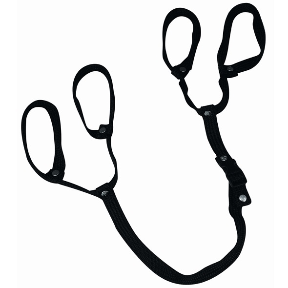 Jest on zakończony czterema pętlami – po parze na każde kończynyrzecz jasna. Nie wymaga wiązania, wystarczy włożyć nogę lub rękęi zacisnąć na niej pętlę.