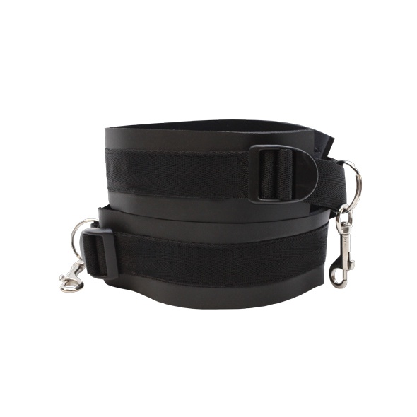Zakończenie stanowią klasycznekółeczka i karabińczyki, co pozwala na spięcie opasek zinnymi akcesoriami, na przykład rozpięcie ud na uprzęży, szerokieich rozwarcie, spięcie z nadgarstkami czy z taśmami.