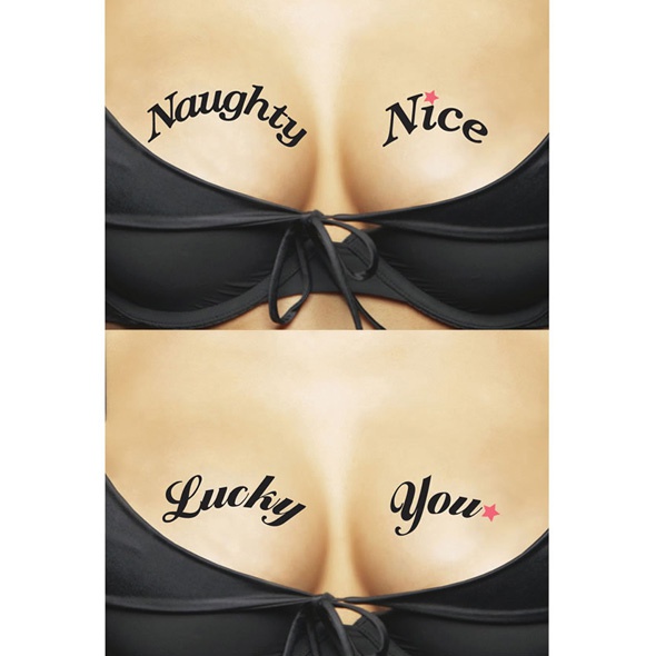 Tatuaże czasowe na dekolt -Ta-Ta-Toos Prowokuj dekoltem i przyciągajwzrok!Napisy: Lucky You – Ty szczęściarzu!Naughty Nice - Niegrzeczna / Niegrzeszna