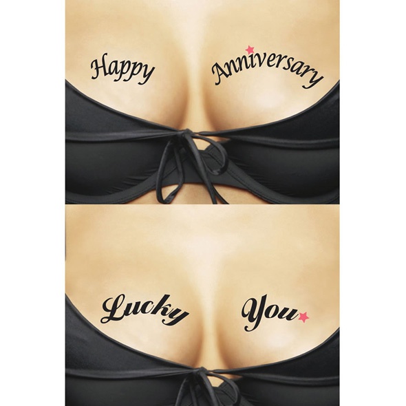 Tatuaże czasowe na dekolt -Ta-Ta-Toos Prowokuj dekoltem i przyciągajwzrok!Napisy: Lucky You – Ty szczęściarzu!Happy Anniversary - Szczęśliwej rocznicy